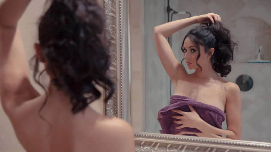 Soon thereafter, Marie shot her solo scene, stripping off her gold dress to reveal the black lingerie beneath. Writhing seductively, she delicately removed the rest, fingering herself with great gusto. After several minutes of utter bewitchment, she stepped away to speak with XBIZ.