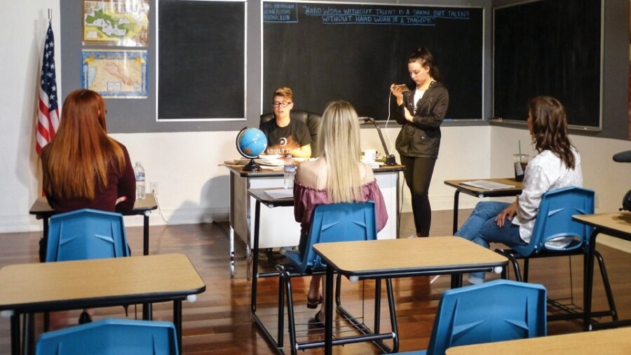 “I’m suddenly hot for teacher,” says a crew member when Kendra James steps into the classroom set, a permanent fixture of this Valley “porn house,” and a symptom of how popular school scenarios are in age-play erotica.