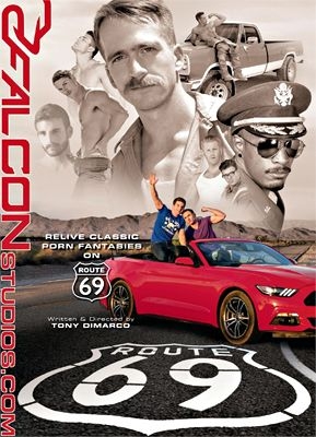 Pack your bags, grab a buddy and hit the road - you never know what can happen on "Route 69!" College buddies Fane Roberts and Dustin Holloway set out on casual a road trip down California's legendary Route 66 but little do they know it will be a journey the will never forget. As they drive their Mustang convertible through the desert the conversation turns to sex and Fane confesses he spent one entire summer jacking off to his favorite classic Falcon porn scenes. As he describes the action to his horned-up travel companion the radio experiences interference and starts playing 70's gay porn music. Suddenly Route 66 becomes "Route 69" where classic gay porn scenarios come to life, reenacted by today's hottest stars.
