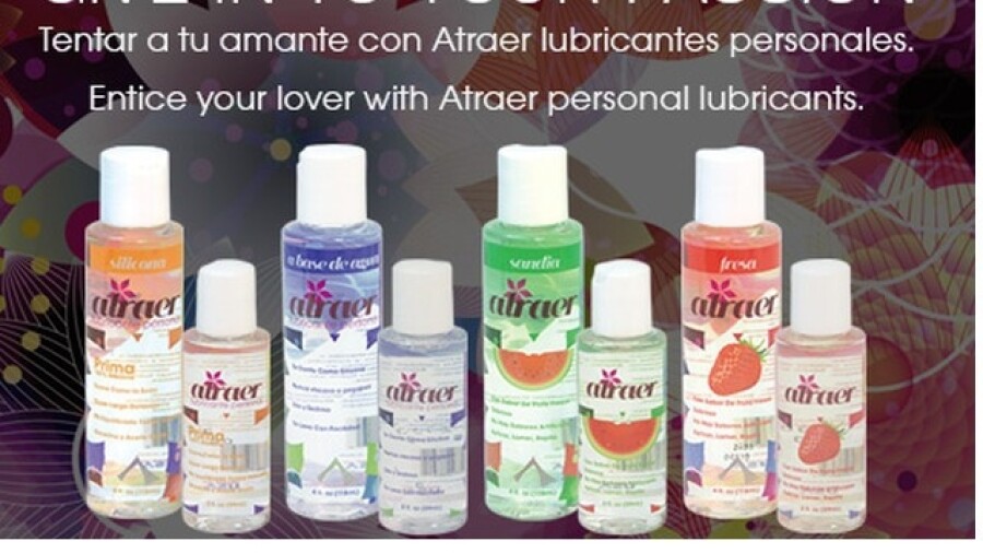 The Spanish-label line includes water-based, silicone and two flavored personal lubricants in two different sizes. "Atraer" means "to attract" in Spanish.