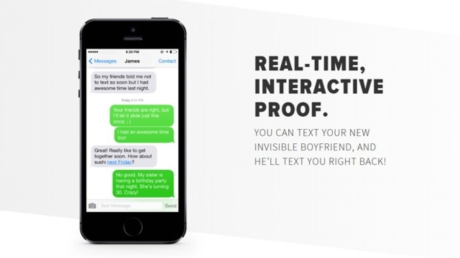 Guys get a similar deal. Invisible Girlfriend provides “real-world and social proof that you’re in a relationship — even if you’re not — so you can get back to living life on your own terms.”