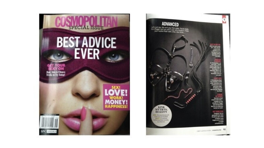 Sportsheets’ Sex & Mischief Red & Black Stripe Flogger appears in a photograph spread of advanced kink play accessories that’s included in Cosmopolitan Special Issue, titled “Best Advice Ever.” Labeled as a “stroke of genius,” Cosmo staff suggest fun new ways to bring flogging into the mix for experienced partners.