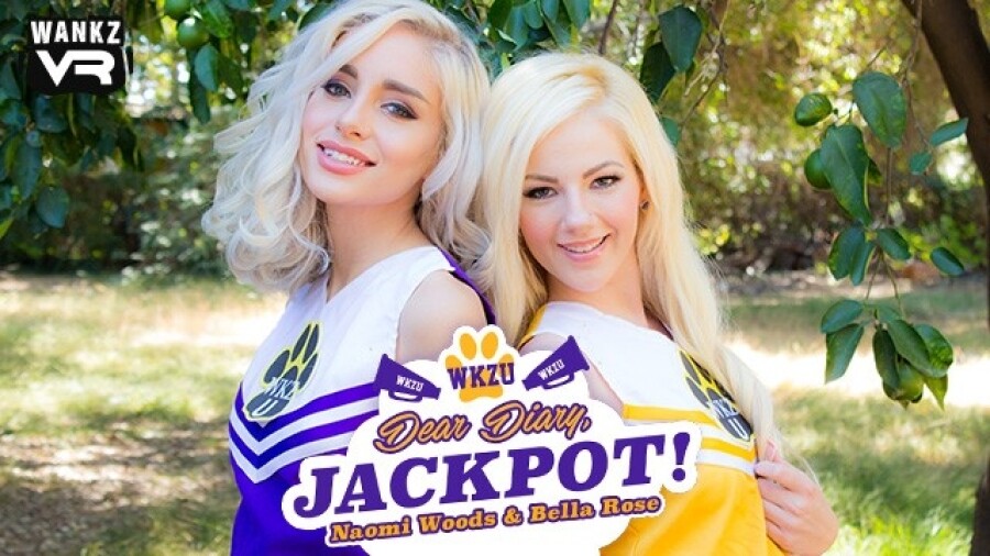 “Dear Diary, Jackpot!” features Naomi Woods and Bella Rose as mischievous cheerleaders, in this example of “teen drama” VR porn revolving around an incriminating sex tape.