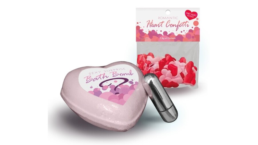 The Sexy Surprise Bath Bomb is a Strawberry-Champagne-scented six-ounce bath bomb that is heart shaped. It slowly dissolves to seductively reveal a hidden vibrating toy. The bullet vibe is fully encased inside the bomb, with three AC13 batteries.
