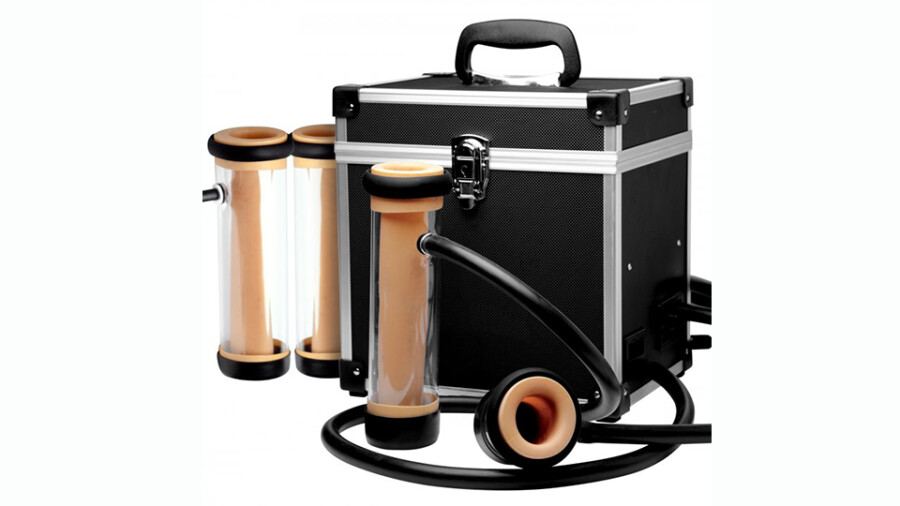 According to a rep, the Super Milker Automatic Deluxe Stroker Machine, part of LoveBotz, comes equipped with a lockable discreet storage container as well as all of the accessories consumers need to enjoy their new device right out of the box: two hoses; three hose plugs; two large smooth cylinders, one large nubbed cylinder and one smaller cylinder; a power dial control; one locking keys; AC/DC transformer; US power cable; and instructions. The Super Milker Automatic Deluxe Stroker Machine is compatible with the XR Brands 110/120 voltage adapter for overseas orders.
