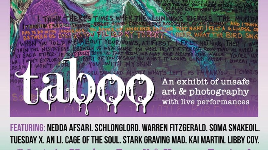 “ ‘Taboo’ is an erotic art experience. It will be a night to remember thanks to our lineup of sensual and savage visual artists, performers and artisan vendors,” Snakeoil said. “Join us to be titillated, educated and disturbed. Creative dress suggested. Wear what makes you feel delicious, delightful, rebellious or vicious.”