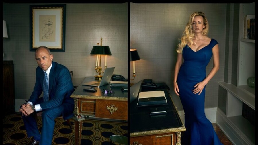 Daniels appears in a royal blue Zac Posen gown, with earrings by Tiffany & Co. Her lawyer, Michael Avenatti, is also featured.