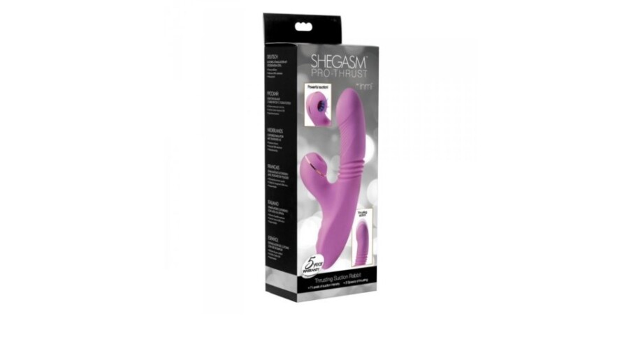 The Shegasm Thrusting Suction Rabbit is the first rabbit vibe to feature pulsating thrusting, powerful vibration, and one-of-a-kind clitoral suction. The shaft performs a three-speed thrusting swivel with massaging ripples and a shape that subtly targets the G-spot, while the external stimulator surrounds the clitoris with seven optional levels of pressurized air pulsation. The Shegasm Thrusting Suction Rabbit is made of silicone and features a waterproof rechargeable motor.