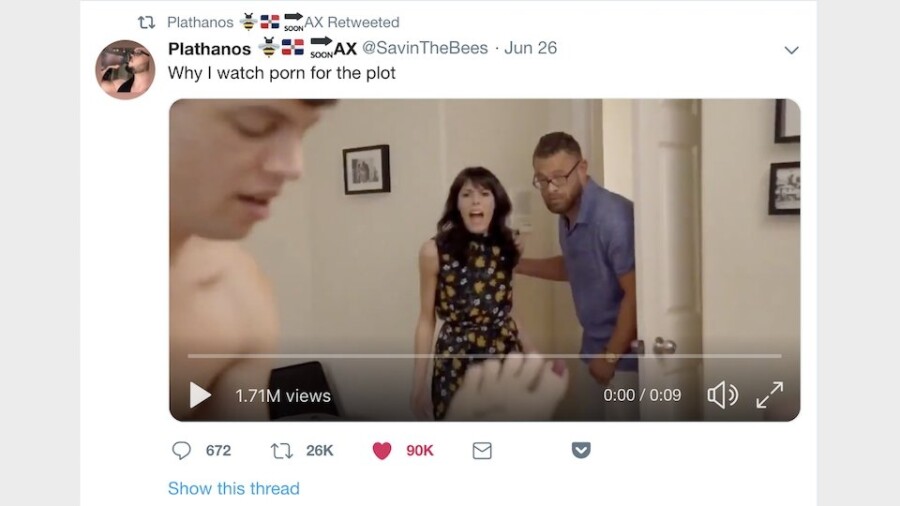 The clip, from a Nubiles scene (now sold as part of their My Family Pies series), was tweeted out by user Plathanos (@SaveTheBees). As of this writing, it has had 1.7 million views, almost 100,000 likes and over 25,000 retweets.
