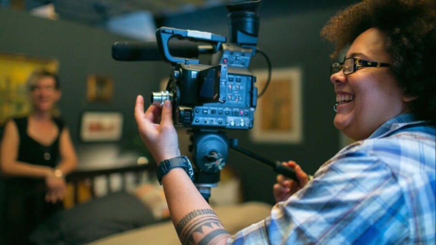 On display are items spanning over a decade of Pink & White Productions’ film history, including a wall of images from the queer porn website CrashPadSeries.com and vitrine artifacts like Houston’s handmade 35mm lens adapter, clippings from her early art career and production binders with storyboards, scene breakdowns and scripts.