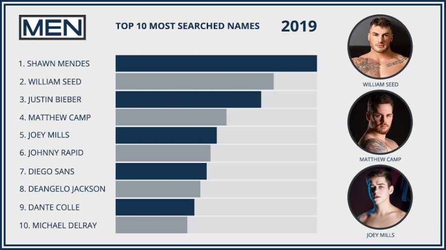 LOS ANGELES — Handsome young pop star Shawn Mendes landed atop Men.com’s Top 10 list of most-searched names for 2019, while another male singer, Justin Bieber, landed at No. 3, joining eight Men skin stars.