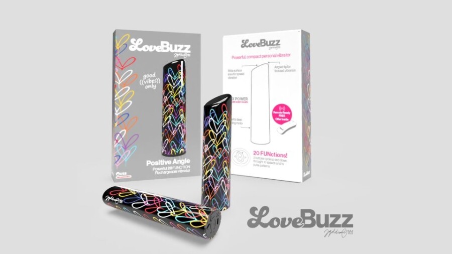 “We are big fans of James Goldcrown, and we are especially excited about the release of the LoveBuzz Positive Angle,” the rep enthused. “You won’t be hiding this vibe in the dresser drawers — this black vibrator with a shower of vibrantly colored hearts is the most beautiful work of art you’ll see in your bedroom this year!”