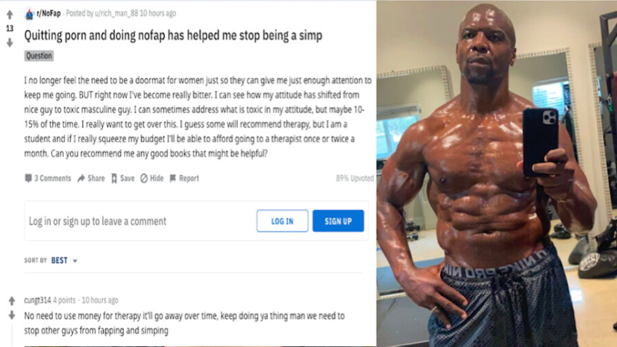 Main Image: Composite image of a #NoFap subreddit thread and a selfie taken by Terry Crews.