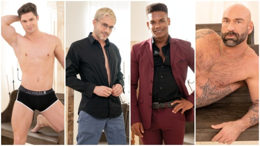 Adrian Hart, Sherman Maus, Dale Savage, Drew Sebastian and Wrex Wylde fill out the cast in "the kinkiest, most get-on-your-knees-and-pray fuckfest starring six religious fist hunks worshipping the fist gods," a rep enthused.