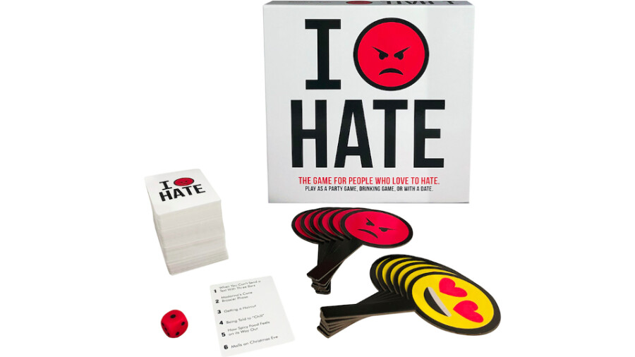 I HATE includes: 1,200 things to hate (200 cards), 12 I Love/I Hate sticks, a die and game rules.