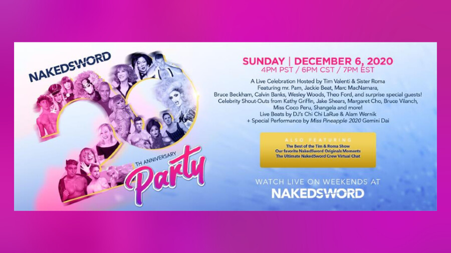 SAN FRANCISCO — NakedSword will cap its yearlong 20th anniversary celebration with a virtual party on Sunday, December 6, beginning at 4 p.m. (PST), hosted by the company's Tim Valenti and Sister Roma and featuring a starry mix of industry and mainstream entertainment guests.