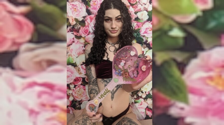 “This release will include her handmade one-of-a-kind paddles, in different sizes, all for your pleasure,” explained a rep. “The pretty pink resin paddles are adorned with pressed flowers and naughty conversation hearts, making them a perfect Valentine’s gift.”