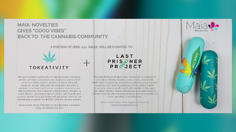 A rep explained Maia will donate a portion of its sales from the Jessi 420 bullet to Tokeativity to sponsor membership costs and the group's charitable outreach. Additionally, Maia has placed a sticker on the package of the Jessi 420 bullet and a pamphlet inside the packaging that tells customers about Tokeativity and LPP.