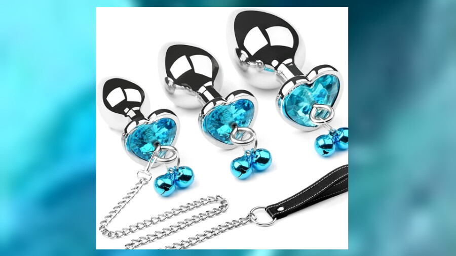 The plugs in the kit are made from "high-quality aluminum alloy, non-toxic and silky smooth with no cracks or sharp points," noted the rep. "The base is bigger than the neck to prevent unwanted travel. And the shiny imitation gem base and double-bells embellishments make the interaction more exciting."