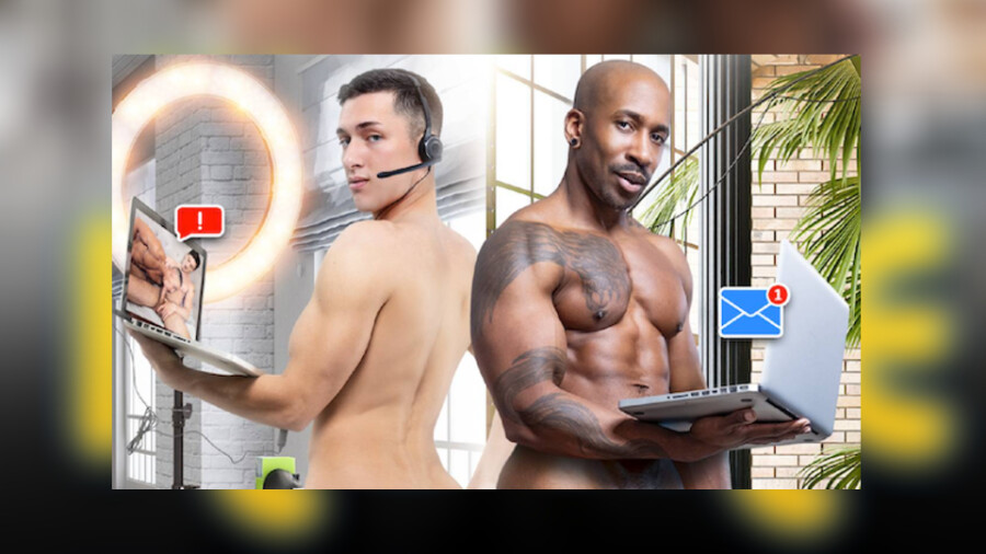 "Tristan leaves a virtual work meeting for a quick 'cum break,' but doesn’t realize that he accidentally left his video on and all of his coworkers are watching him thrust his long dick into Jim's hungry hole," added the rep. "Multi-regional director Max is shocked by Tristan's behavior, but not enough to actually turn off the NSFW video call. After watching his employee engage in some action, Max employs assistant Andy to choke on and suck off his XXL cock."