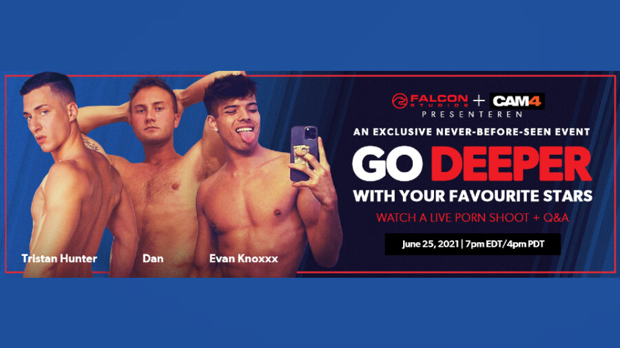 SAN FRANCISCO — Falcon/NakedSword exclusive Tristan Hunter will be joined by Evan Knoxxx and Dan for the fourth and final live cam event hosted by CAM4 that broadcasts in real time the filming of an actual Falcon production. The men will take the stage Friday at 4 p.m. (PDT).