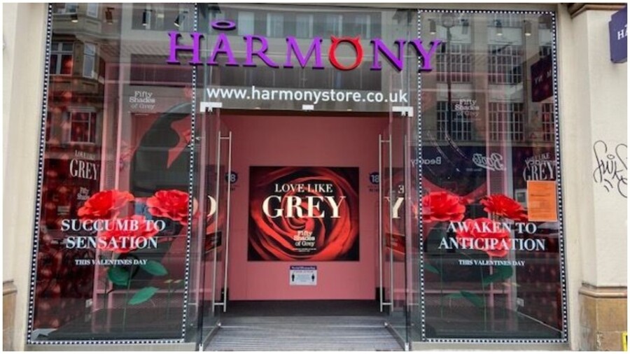 As seen in the window display for the Harmony London brick-and-mortar store, "the words ‘Succumb to Sensation’ feature on one side of the store window, with the Fifty Shades of Grey Sensation Rechargeable G-Spot Rabbit Vibrator teasing passersby with the phrase," the rep said. "On the other side of the display, the Fifty Shades of Grey Sweet Anticipation Wrist Cuffs want you to ‘Awaken to Anticipation,' luring shoppers inside."