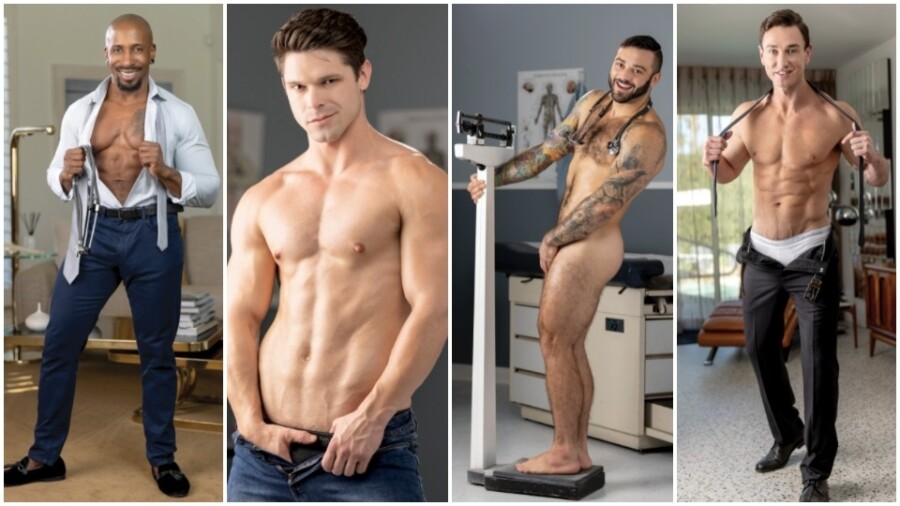 "When Austin finds himself with a glass dildo stuck in his hole, he calls on Dr. Max for a very intimate house call. Always a courteous professional, Dr. Konnor is able to remove it immediately and even offers up his 10-inch tool to further examine Austin’s hungry ass," continued the rep. "After getting his first COVID shot, Devin quickly finds himself in the middle of the vaccination site with his pants down and getting railed by Dr. Lucca. When Adrian finds out that beefcake daddy Lucca is his new doctor, the young muscle stud immediately strips down and throws his legs in the air for a bareback examination."