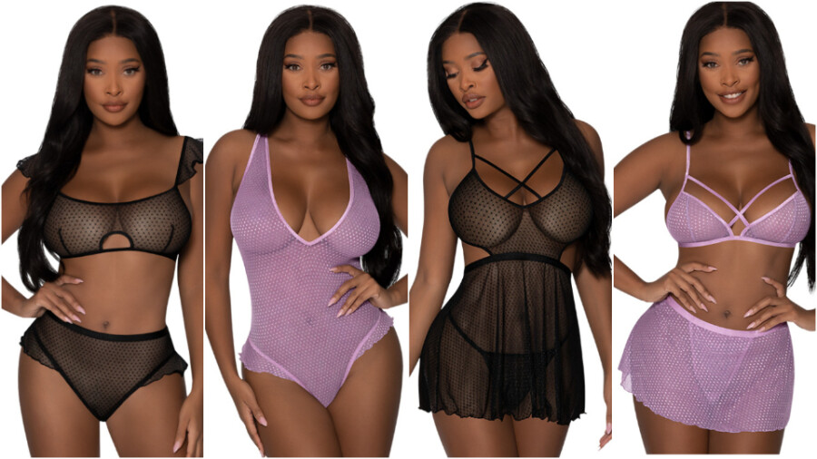 "These seductive garments are made with stretchy, yet conforming polka dot mesh, accented with frilly ruffles," a rep said. "Amorous extras include adjustable shoulder straps, peek-a-boo details and strappy crisscross designs, with swan hook and hook-and-eye closures."