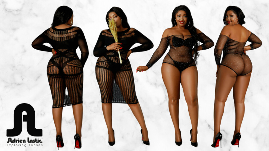 Moonlight is described as "a contemporary line offering sleek, off-the-shoulder bodysuits, skintight maxi dresses and curve-enhancing teddies," noted the rep. Sized from 10-18, the line integrates "fashion-forward, modern clubwear with intricate lingerie accents" such as embellishments that include rhinestones, lace patterns, linear stripes and sheer mesh fabrics.