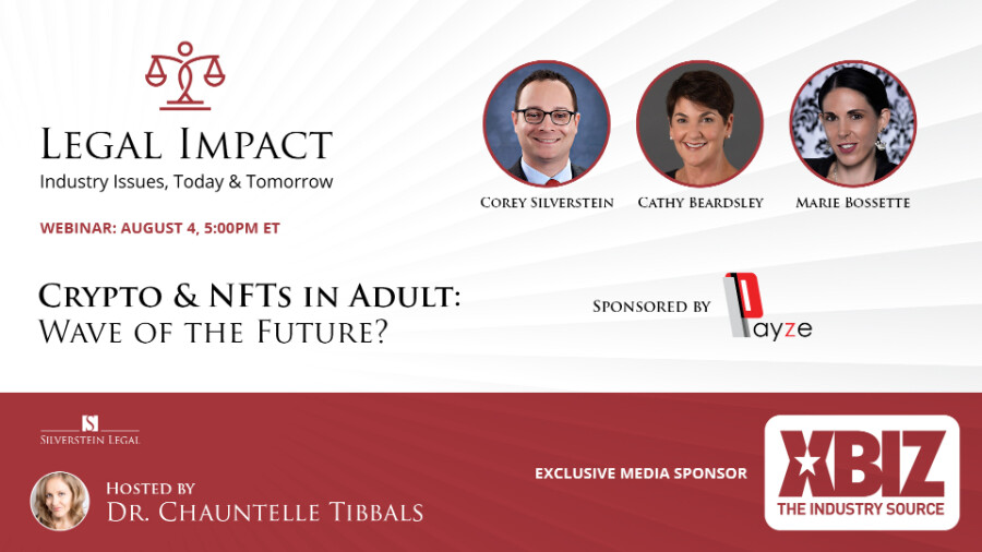 LOS ANGELES — Adult industry attorney Corey D. Silverstein will host the next live, online edition of his "Legal Impact" series, titled "Crypto & NFTs in Adult: Wave of the Future?" this Thursday at 2 p.m. PDT with special guests Marie Bossette, owner of Marie Bossette Entertainment, and Cathy Beardsley, president and CEO of Segpay.