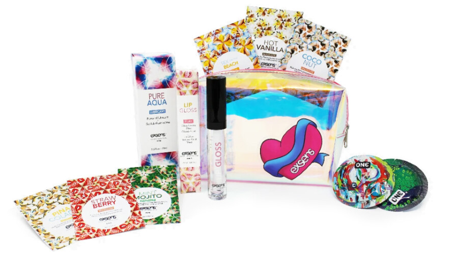 The kit includes "a super-cute, reusable zippered vanity bag," noted a rep, and contains a full-sized Pure Aqua water-based lubricant, a full-sized tube of Strawberry Arousal Lip Gel, foil packs of all six warming massage gel flavors and two vegan condoms.