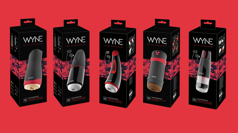 The WYNE line features "Masturbator 01" with vibration, sucking and warming functions, "Masturbator 02" with vibrating, sucking and moaning functions, "Masturbator 03" with vibrating, sucking, warming and moaning functions, "Masturbator 04" with vibrating and sucking functions and "Masturbator 05" with thrusting, rotating, moaning and LED light functions.