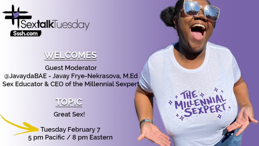 LOS ANGELES — Sex Educator and Millennial Sexpert CEO Javay Frye-Nekrasova will serve as special guest moderator on tomorrow’s edition of the Twitter-based chat show #SexTalkTuesday to discuss "great sex."