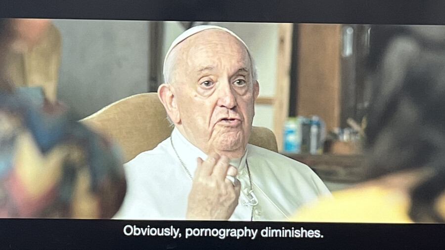 Pope Francis then expresses his opinions about pornography, including his belief that it is addictive like drugs and alcohol, and leaves those who use it “diminished as humans.”