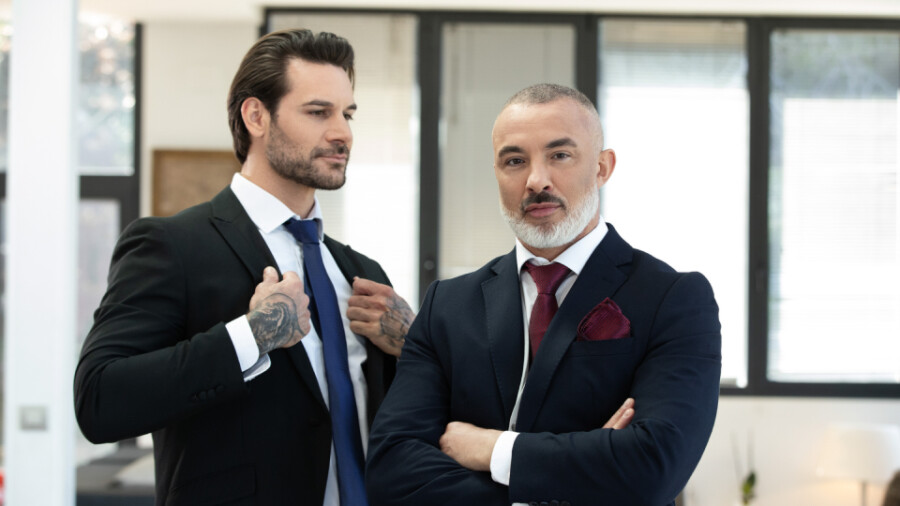 "Papi takes the initiative to bend the interviewer over the conference table and tease his hole, then fucks him doggystyle," the synopsis reveals. "It's a good sign when your interviewer is on his knees worshipping your cock and balls, then riding your dick."