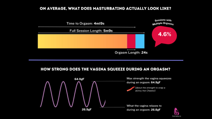For example, the study found that over the past year, orgasms lasted an average of 24.01 seconds, with the average time to the first orgasm during masturbation being four minutes and 19 seconds, with an average strength of 64.88 gF (gram force).