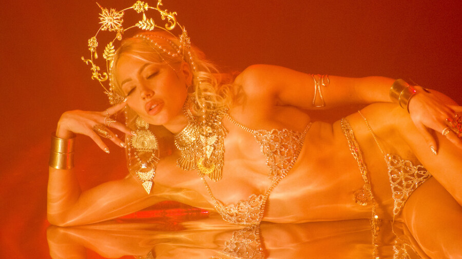 What appears to the naked eye as a black wall, a plastic tarp and smog from a noisy machine in the back, reads on camera like a marvelous red-tinted mystical dimension. Within this uncanny space, a figure clad in a gold bikini and matching bejeweled headdress emerges: Ivy Wolfe, who co-stars in the short with Gamble. She undulates to trance music, skillfully striking yoga-like poses.