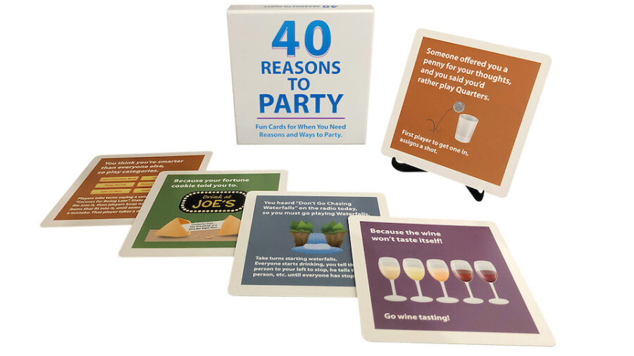 "40 Reasons to Party" is a card game that provides both reasons and ideas for partying. The game features a collection of 40 illustrated cards, accompanied by a stand for card display. Players participate by acting out the activities and suggestions presented on each card.