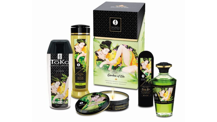 The Garden of Edo collection now features a standing green box with the Shunga Erotic Art couple on the front. It includes Organica Green Tea Kissable massage oil, the warming Green Tea Aphrodisiac Oil, Zenitude Green Tea massage candle, Toko Organica personal lubricant and Lotus Noir Sensitizing Gel.