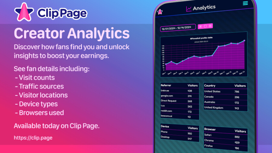 “Creators are incredibly savvy about tracking their online presence and understanding their audience,” said founder Dan Cooper. “Many have expressed interest in gaining deeper insights into their traffic patterns on Clip Page to refine their marketing strategies. With Creator Analytics, we’re giving creators the tools to seamlessly complement their approach, offering the data they need to promote their Clip Page at the right time and maximize their earnings.”