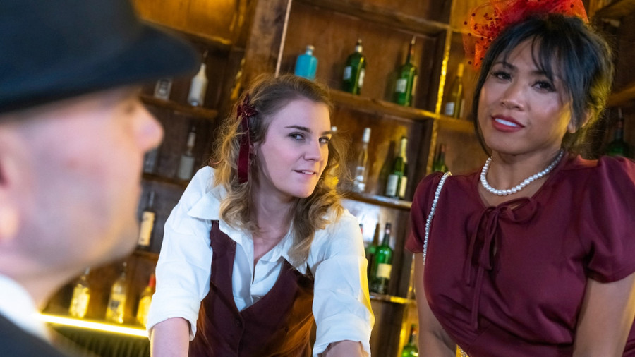 The clip opens with Snow and Wyatt West, who portrays her boyfriend, drinking at an old-timey speakeasy. Ray Ray is serving them drinks, and it doesn't take much for Snow to begin flirting with her.