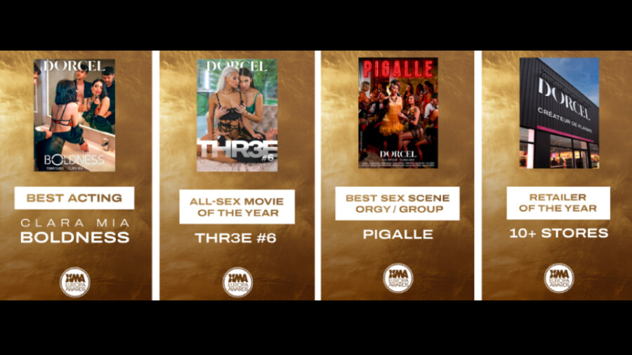 PARIS — Dorcel won All-Sex Movie of the Year ("THR3E #6"), Best Acting (Clara Mia in "Boldness"), Best Sex Scene — Orgy/Group ("Pigalle"), and Retailer of the Year (10+ Stores) at the 2025 Euro XMAs.