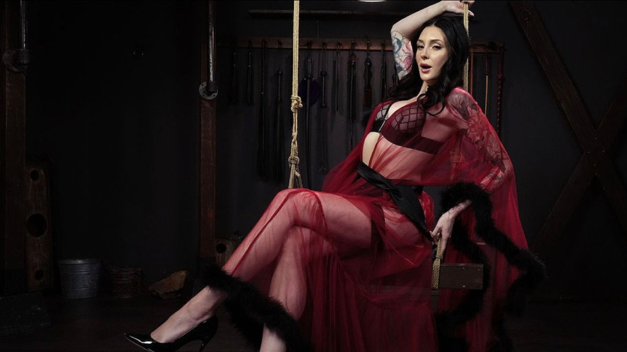 The scene opens with Sins, in black lingerie and heels, sitting on a rope swing.