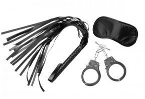 Perfect for couples who have always wanted to try bondage, this kit has everything you need to have a naughty good time. Included is one pair of lightweight metal handcuffs that will fit most size wrists with a safety release lever just in case you lose the keys. Also included is a 24 inch long vinyl flogger, with 18 tails that have a soft underside for light impact with a sting. Want to do it in the dark? Use the included black out blindfold, cushioned and with a double strap for security.