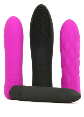 A silky pleasure set featuring tons of stimulating vibe patterns and three interchangeable silicone sleeves, Evolved Novelties' Pleasure Sleeve Trio can be customized perfectly to suit steamy scenarios of all sorts.Smooth and classically shaped, the core bullet vibe slips easily into the included interchangeable tips. Choose from a big chubby bulb textured to target external sweet spots, a ripply sleek swell or a length of subtle quilted bumps. Ten modes of steady, pulsating and roller-coaster escalation resonate evenly through Trio- once the sleeve's in place, activate vibration with a touch of the bullet's power button.