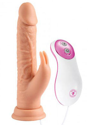 This toy seems to have it all. It’s a girthy and realistic-textured, vibrating dildo with a set of rabbit ears placed precariously near a woman’s sensitive bits. It also has a suction cup at the base, which we can attest, holds pretty well to a smooth surface.