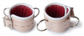 Our design department has developed a brand new set of wrist cuffs that will go great with your hospital bed.Presenting the Deluxe Padded Medical Wrist Restraints, the newest leather cuff to come from our LA workshop. These restraints come in a gorgeous, traditional tan leather with white binding borders, and a glove-weight red leather padded lining that keeps the restrained patient from moving or escaping, but offers a comfortable encasement of the wrist.