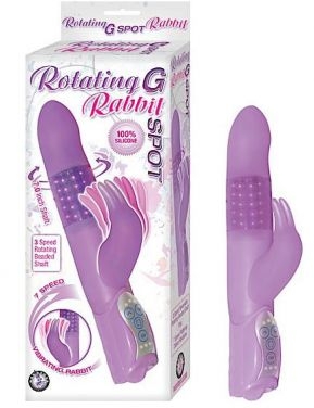 Rotating G-Spot Rabbit Vibrator Purple features 100% Silicone.3 speed reversible rotating beaded shaft. 7 speed variable vibrating rabbit ears. Easy to use. EZ to use controller. Waterproof vibrations for play in and out of the water. Made using phthalates free, RoHS compliant materials: shaft, rabbit clitoral stimulator Silicone, Control ABS plastic. Vibrating sex toy requires 3 AA batteries, not included. Do not leave batteries in the vibrator between uses. Always clean before and after use.
