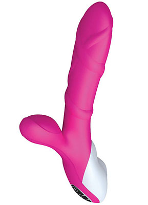 Exclusive touch-sensitive “Temperature Sensor System”, increases vibration intensity as body heat is detected by built-in sensor during use. Subtle raised stimulating band around shaft, with clit-stem. Quiet 3-motor system (2 in shaft, 1 in clit-stem), choice of 10 vibration levels activated via push-button. Measuring 8 ½” x 1 1/2”, the TAKO is constructed of top quality, odourless, body friendly silicone. Lightweight. splash-proof and rechargeable via USB connection or A/C power supply. The heavy duty Li-ion battery allows for up to 3 hours between charges.Materials: medical grade Silicone / ABS (base/handle).