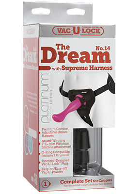 Everything you need for amazing strap-on sex in one box! Includes the Vac-U-Lock™ Supreme harness made in stylish neoprene, adjustable up to 69" for a comfortable fit. Combined with the included Platinum Premium Silicone Dream attachment, you can enjoy rigorous play with just a snap. The G-spot-pleasing Dream No. 14 is based on our award-winning Lucid Dreams No.14. It has an insertable length of 7”. The Dream is 100% phthalate-free Platinum silicone and proudly Made in America. Additionally, each set includes a removable black Vac-U-Lock plug, two O-rings, powder, and an instructional brochure. All Vac-U-Lock products are interchangeable; the harness can also be used with all O-ring compatible toys.Copyright © 2026 Adnet Media. All Rights Reserved. XBIZ is a trademark of Adnet Media.